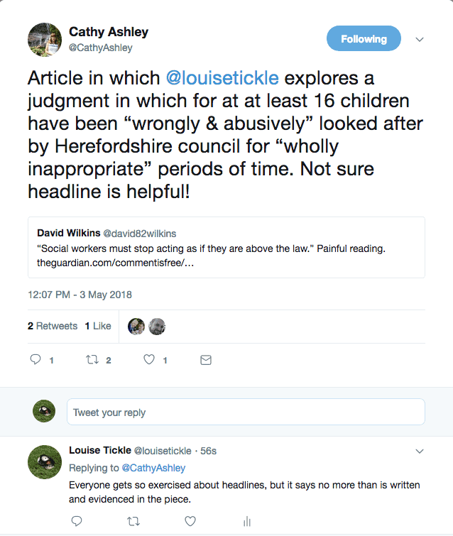 One person emailed me to alert me to the publication of a very ‘one-sided’ article (“even for the Guardian”). He was concerned about the “failure to recognise that social workers have a thankless task and, as post-Baby P showed, they’re the first to be targeted by the media when the make an incorrect assessment. Their workload also look hideous, in a perpetual era of worsening austerity.” I asked if he had read the linked judgment. He hadn’t. My view is that there is no criticism of individual social workers in Tickle’s piece – if anyone is criticised within Hereford, it is senior managers. But they are not named and shamed, and nor are they smeared with un-evidenced criticism.